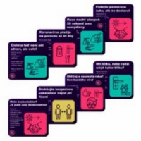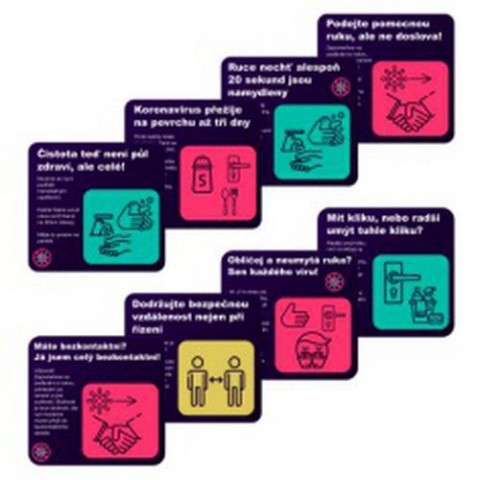 Bezpečnostní značení tabulkou, značkou nebo samolepkou "Sada samolepek COVID - 8 ks" tiskneme na vysoce kvalitním materiálu, barvami s vysokou odolností proti otěru a UV záření. Tím zajišťujeme splnění požadavků Nařízení vlády č. 375/2017 Sb. a ČSN EN ISO 7010 včetně Národní přílohy NA. Sada 8 samolepek s návody a popisy jak postupovat a bránit šíření virové a kapénkové nákazy.Výstražné samolepky COVID, sada 8 ks, 148 x 148 x 0,1 mm
