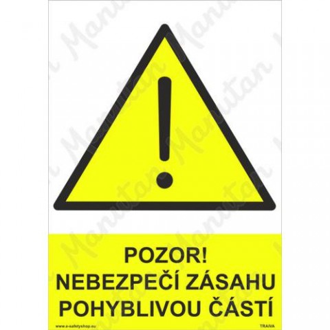 Bezpečnostní značka, tabulka nebo samolepka "Pozor nebezpečí zásahu pohyblivou částí" plně odpovídá požadavkům právních a technických předpisů, zejména Nařízení vlády č. 375/2017 Sb., ČSN ISO 3864-1, ČSN ISO 3864-2, ČSN ISO 3864-3, ČSN ISO 3864-4.Výstražné tabulky - Pozor nebezpečí zásahu pohyblivou částí