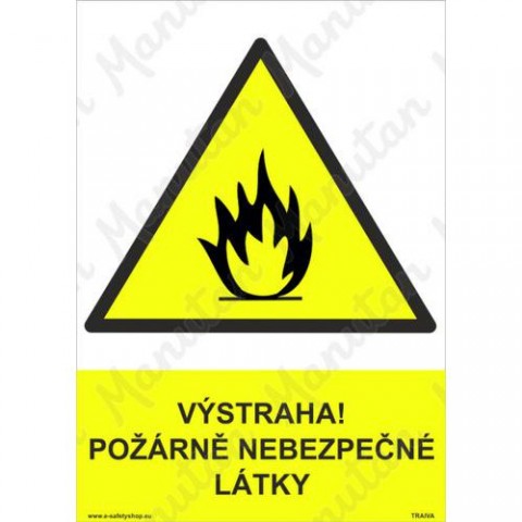 Bezpečnostní značení tabulkou, značkou nebo samolepkou "Výstraha! Požárně nebezpečné látky" je tištěno na vysoce kvalitním materiálu, barvami s vysokou odolností proti otěru a UV záření. Tak, aby provedení značení bylo plně v souladu s Nařízením vlády č. 375/2017 Sb., ČSN ISO 3864 a ČSN ISO 3864-1.Výstražné tabulky - Výstraha požárně nebezpečné látky