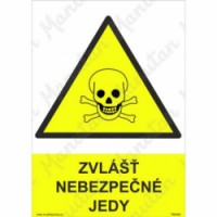 Bezpečnostní značení tabulkou, značkou nebo samolepkou "Zvlášť nebezpečné jedy" tiskneme na vysoce kvalitním materiálu, barvami s vysokou odolností proti otěru a UV záření. Tím zajišťujeme splnění požadavků Nařízení vlády č. 375/2017 Sb., ČSN ISO 3864-1, ČSN ISO 3864-2, ČSN ISO 3864-3, ČSN ISO 3864-4.Výstražné tabulky - Zvlášť nebezpečné jedy