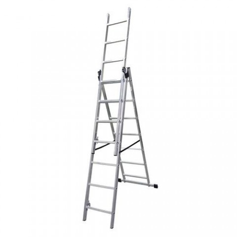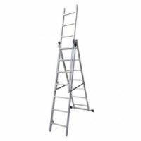 Víceúčelové žebříky vyrobené z odolných hliníkových lisovaných profilů vhodné pro práci ve výškách. Lze použít jako štafle, výsuvný nebo opěrný žebřík. Drážky na povrchu příček a protiskluzové patky pro větší bezpečnost. Bezpečnostní háčky zabraňují náhodnému rozložení žebříku. Certifikováno dle TUV a EN 131.Výsuvný hliníkový žebřík Basic, 3 x 7 příček