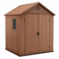 Zahradní kůlny na nářadí, sekačky, kola, grily a jiná zařízení na zahradu. Robustní konstrukce s ocelovými výztuhami a dvojitými stěnami vyrobená z materiálu Evotech (dřevo-plast), který je velmi odolný vůči povětrnostním vlivům. Kvalitní podlahové panely udržuji nářadí a stroje v suchu a čistotě, lze uložit i těžší vybavení jako jsou sekačky či čtyřkolky aj. Dvojité široké dveře pro jednoduchou manipulaci se stroji. Postranní okno zajišťuje dostatek světla uvnitř domku. Pod střechou jsou umístěné větrací otvory pro cirkulaci vzduchu. Vnitřní rozměry jsou 212 x 174 x 176 cm.Zahradní domek Darwin 6 x 6, hnědý