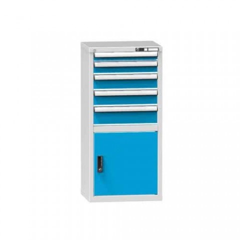 Zásuvková skříň je opatřená mechanismem centrálního zamykání a blokace zásuvek. Zásuvky jsou základním skladovacím prvkem, a proto splňují vysoké požadavky na pevnost a stabilitu. Korpusy zásuvkových skříní tvoří svařenec jednotlivých konstrukčních dílů z kvalitních ocelových plechů. Vnitřní konstrukce korpusů je opatřena perforací po 25 mm. Tuto perforaci využíváme k uchycení vodicích lišt zásuvek, jejich výškovému uspořádání a nakonfigurování požadované zásuvkové sestavy. Přestavování vodicích lišt nebo háčků polic probíhá jednoduše a velice rychle bez použití nástrojů.Zásuvkové skříně ZN2, 578 x 464 x 1215 mm