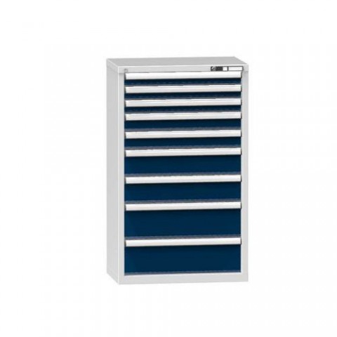 Zásuvková skříň je opatřená mechanismem centrálního zamykání a blokace zásuvek. Zásuvky jsou základním skladovacím prvkem, a proto splňují vysoké požadavky na pevnost a stabilitu. Korpusy zásuvkových skříní tvoří svařenec jednotlivých konstrukčních dílů z kvalitních ocelových plechů. Vnitřní konstrukce korpusů je opatřena perforací po 25 mm. Tuto perforaci využíváme k uchycení vodicích lišt zásuvek, jejich výškovému uspořádání a nakonfigurování požadované zásuvkové sestavy. Přestavování vodicích lišt nebo háčků polic probíhá jednoduše a velice rychle bez použití nástrojů.Zásuvkové skříně ZP4, 731 x 464 x 1215 mm