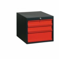 Svařovaná konstrukce kontejneru z ocelového plechu t. 0,7 až 2 mm. 100% výsuv zásuvek, kuličková ložiska pojezdů, uzamykání cylindrickým zámkem se dvěma klíči. Horní dvě zásuvky včetně dělicích příček. Povrchová úprava práškovou barvou.Závěsné kontejnery, 47 x 51 x 59 cm, 3 zásuvky